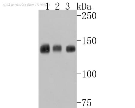 Western blot analysis of Hamartin on different lysates with Mouse anti-Hamartin antibody (HA600004) at 1/500 dilution. Lane 1: Hela cell lysate Lane 2: 293 cell lysate Lane 3: NIH/3T3 cell lysate Lysates/proteins at 10 µg/Lane. Predicted band size: 130 kDa Observed band size: 145 kDa Exposure time: 2 minutes; 6% SDS-PAGE gel. Proteins were transferred to a PVDF membrane and blocked with 5% NFDM/TBST for 1 hour at room temperature. The primary antibody (HA600004) at 1/500 dilution was used in 5% NFDM/TBST at room temperature for 2 hours. Goat Anti-Mouse IgG - HRP Secondary Antibody (HA1006) at 1:20,000 dilution was used for 1 hour at room temperature.