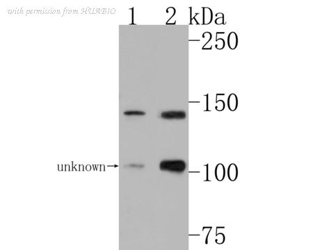 Western blot analysis of Hamartin on different lysates with Rabbit anti-Hamartin antibody (HA723665) at 1/20,000 dilution. Lane 1: HeLa cell lysate Lane 2: 293T cell lysate Lane 3: COS-1 cell lysate Lane 4: NIH/3T3 cell lysate Lane 5: MEF cell lysate Lane 6: C2C12 cell lysate Lane 7: PC-12 cell lysate Lane 8: C6 cell lysate Lane 9: Mouse brain tissue lysate Lane 10: Mouse heart tissue lysate Lane 11: Rat brain tissue lysate Lysates/proteins at 20 µg/Lane. Predicted band size: 130 kDa Observed band size: 140 kDa Exposure time: 1 minute; ECL: K1801; 4-20% SDS-PAGE gel. Proteins were transferred to a PVDF membrane and blocked with 5% NFDM/TBST for 1 hour at room temperature. The primary antibody (HA723665) at 1/20,000 dilution was used in primary antibody dilution (K1803) at 4℃ overnight. Goat Anti-Rabbit IgG - HRP Secondary Antibody (HA1001) at 1/50,000 dilution was used for 1 hour at room temperature.