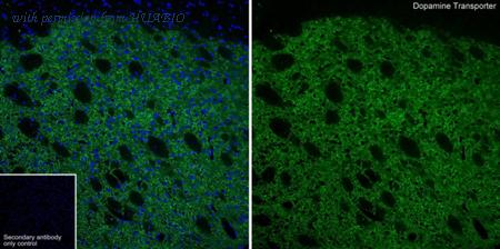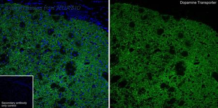 Immunohistochemical analysis of paraffin-embedded mouse brain tissue with Rabbit anti-Dopamine Transporter antibody (HA751352) at 1/1,000 dilution. The section was pre-treated using heat mediated antigen retrieval with Tris-EDTA buffer (pH 9.0) for 20 minutes. The tissues were blocked in 1% BSA for 20 minutes at room temperature, washed with ddH2O and PBS, and then probed with the primary antibody (HA751352) at 1/1,000 dilution for 1 hour at room temperature. The detection was performed using an HRP conjugated compact polymer system. DAB was used as the chromogen. Tissues were counterstained with hematoxylin and mounted with DPX.