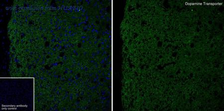 Immunohistochemical analysis of paraffin-embedded mouse striatum tissue with Rat anti-Dopamine Transporter antibody (HA601404) at 1/2,000 dilution. The section was pre-treated using heat mediated antigen retrieval with Tris-EDTA buffer (pH 9.0) for 20 minutes. The tissues were blocked in 1% BSA for 20 minutes at room temperature, washed with ddH2O and PBS, and then probed with the primary antibody (HA601404) at 1/2,000 dilution for 1 hour at room temperature. The detection was performed using an HRP conjugated compact polymer system. DAB was used as the chromogen. Tissues were counterstained with hematoxylin and mounted with DPX.