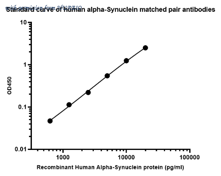 Sandwich ELISA analysis of Human Alpha-Synuclein matched pair antibodies Capture: HA723467, Human Alpha-Synuclein Rabbit mAb [JB42-33] Detector: HA723468, Human Alpha-Synuclein Rabbit mAb [PSH12-56] Elisa assay was performed by coating wells of a 96-well plate with 50 µl per well of capture antibody (HA723467) diluted in carbonate/bicarbonate buffer, at a concentration of 5 µg/ml overnight at 4℃. Wells of the plate were washed, blocked with 150 µl 0.05% tween-20 1%BSA blocking buffer, and incubated with serial diluted Human Alpha-synuclein protein (HA211150) starting from 20,000 pg/ml to 0 pg/ml and detect antibody (HA723468, Biotin, 0.2 µg/ml) for 1 hour at 30℃ with shaking. Then the plate was washed and incubated with 50 µl per well of SA-HRP for 0.5 hour at 30℃ with shaking. Detection was performed using an Ultra TMB Substrate for 10 minutes at room temperature in the dark. The reaction was stopped with sulfuric acid and absorbances were read on a spectrophotometer at 450 nm.