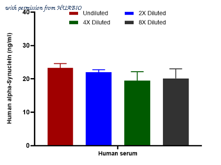 Interpolated concentrations of native alpha-Synuclein in human serum samples. Capture: HA723467, Human Alpha-Synuclein Rabbit mAb [JB42-33] Detector: HA723468, Human Alpha-Synuclein Rabbit mAb [PSH12-56] The concentrations of alpha-Synuclein were measured in duplicates, interpolated from the alpha-Synuclein standard curve and corrected for sample dilution. Undiluted samples are human serum 50%. The interpolated dilution factor corrected values are plotted (mean +/- SD, n=2). The mean alpha-Synuclein concentration was determined to be 21.2 ng/ml in human serum.