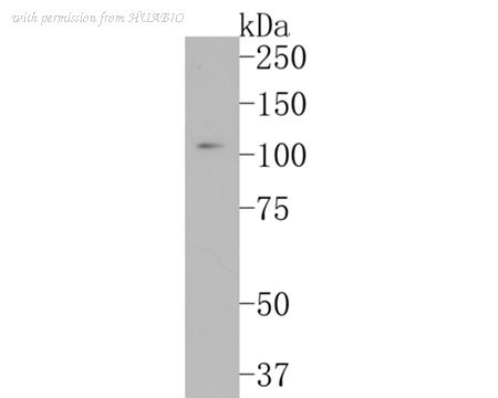 Western blot analysis of CD43 on K562 cell lysates. Proteins were transferred to a PVDF membrane and blocked with 5% BSA in PBS for 1 hour at room temperature. The primary antibody (EM1901-70, 1/200) was used in 5% BSA at room temperature for 2 hours. Goat Anti-Mouse IgG - HRP Secondary Antibody (HA1006) at 1:5,000 dilution was used for 1 hour at room temperature.
