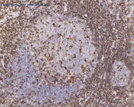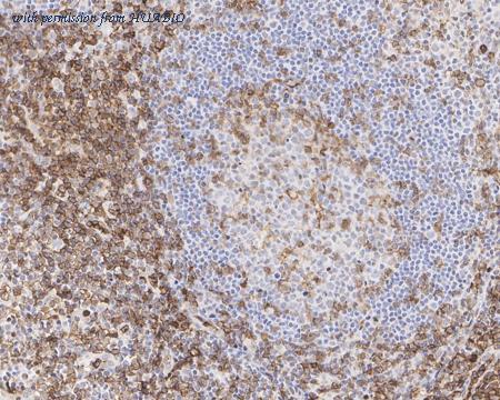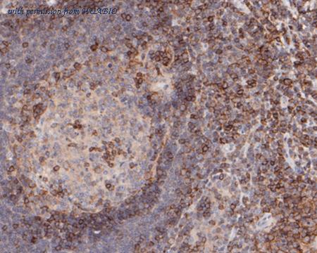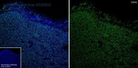 Immunohistochemical analysis of paraffin-embedded human tonsil tissue with Rabbit anti-CD43 antibody (HA721219) at 1/5,000 dilution. The section was pre-treated using heat mediated antigen retrieval with Tris-EDTA buffer (pH 9.0) for 20 minutes. The tissues were blocked in 1% BSA for 20 minutes at room temperature, washed with ddH2O and PBS, and then probed with the primary antibody (HA721219) at 1/5,000 dilution for 1 hour at room temperature. The detection was performed using an HRP conjugated compact polymer system. DAB was used as the chromogen. Tissues were counterstained with hematoxylin and mounted with DPX.