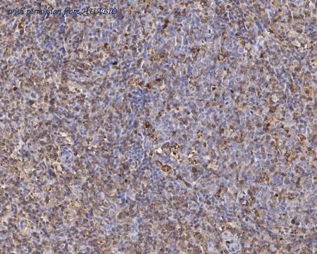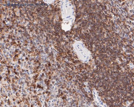 Immunohistochemical analysis of paraffin-embedded human B-cell lymphoma tissue with Rabbit anti-CD43 antibody (HA721219) at 1/5,000 dilution. The section was pre-treated using heat mediated antigen retrieval with Tris-EDTA buffer (pH 9.0) for 20 minutes. The tissues were blocked in 1% BSA for 20 minutes at room temperature, washed with ddH2O and PBS, and then probed with the primary antibody (HA721219) at 1/5,000 dilution for 1 hour at room temperature. The detection was performed using an HRP conjugated compact polymer system. DAB was used as the chromogen. Tissues were counterstained with hematoxylin and mounted with DPX.