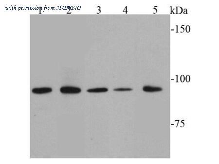 Western blot analysis of STAT6 on different cell lysates using anti-STAT6 antibody at 1/1,000 dilution. Positive control: Lane 1: Raji cell lysate Lane 2: Daudi cell lysate Lane 3: Hela cell lysate Lane 4: Ags cell lysate Lane 5: Jurkat cell lysate