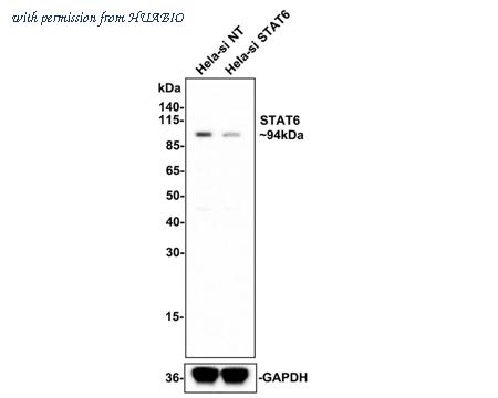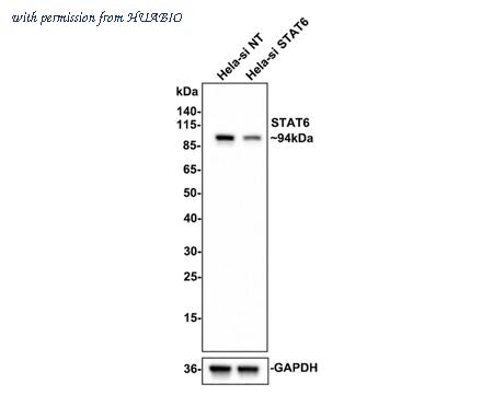 Western blot analysis of STAT6 on different lysates with Rabbit anti-STAT6 antibody (ER40121) at 1/500 dilution. Lane 1: Hela-si NT cell lysate Lane 2: Hela-si STAT6 cell lysate Lysates/proteins at 10 µg/Lane. Predicted band size: 94 kDa Observed band size: 94 kDa Exposure time: 46 seconds; 4-20% SDS-PAGE gel. ER40121 was shown to specifically react with STAT6 in Hela-si NT cells. Weakened band was observed when Hela-si STAT6 sample was tested. Hela-si NT and Hela-si STAT6 samples were subjected to SDS-PAGE. Proteins were transferred to a PVDF membrane and blocked with 5% NFDM in TBST for 1 hour at room temperature. The primary antibody (ER40121, 1/500) and Loading control antibody (Rabbit anti-GAPDH, ET1601-4, 1/10,000) were used in 5% BSA at room temperature for 2 hours. Goat Anti-rabbit IgG-HRP Secondary Antibody (HA1001) at 1:300,000 dilution was used for 1 hour at room temperature.