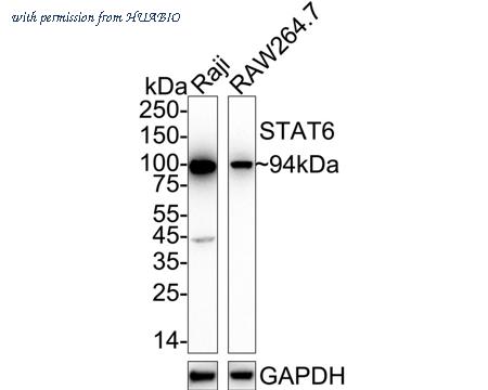 Western blot analysis of STAT6 on different lysates with Rabbit anti-STAT6 antibody (ET1607-61) at 1/2,000 dilution. Lane 1: Raji cell lysate Lane 2: RAW264.7 cell lysate Lysates/proteins at 30 µg/Lane. Predicted band size: 94 kDa Observed band size: 94 kDa Exposure time: 3 minutes; ECL: K1801; 4-20% SDS-PAGE gel. Proteins were transferred to a PVDF membrane and blocked with 5% NFDM/TBST for 1 hour at room temperature. The primary antibody (ET1607-61) at 1/2,000 dilution was used in 5% NFDM/TBST at 4℃ overnight. Goat Anti-Rabbit IgG - HRP Secondary Antibody (HA1001) at 1/50,000 dilution was used for 1 hour at room temperature.
