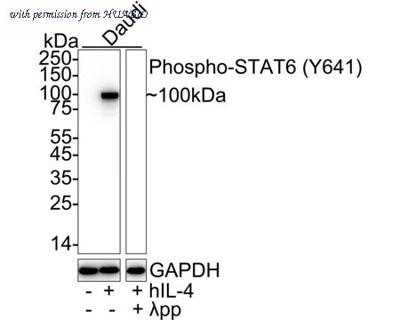 Western blot analysis of Phospho-STAT6 (Y641) on different lysates with Rabbit anti-Phospho-STAT6 (Y641) antibody (HA722776) at 1/1,000 dilution. Lane 1: Daudi cell lysate Lane 2: Daudi treated with 100ng/mL hIL-4 for 15 minutes cell lysate Lane 3: Daudi treated with 100ng/mL hIL-4 for 15 minutes cell lysate, then the membrane treated with λpp for 1 hour Lysates/proteins at 20 µg/Lane. Predicted band size: 94 kDa Observed band size: 100 kDa Exposure time: 30 seconds; ECL: K1801; 4-20% SDS-PAGE gel. Proteins were transferred to a PVDF membrane and blocked with 5% NFDM/TBST for 1 hour at room temperature. The primary antibody (HA722776) at 1/1,000 dilution was used in 5% NFDM/TBST at 4℃ overnight. Goat Anti-Rabbit IgG - HRP Secondary Antibody (HA1001) at 1/50,000 dilution was used for 1 hour at room temperature.