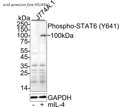 Western blot analysis of Phospho-STAT6 (Y641) on different lysates with Rabbit anti-Phospho-STAT6 (Y641) antibody (HA722776) at 1/2,000 dilution. Lane 1: J774A.1 cell lysate Lane 2: J774A.1 treated with 10ng/mL mIL-4 for 2 hours cell lysate Lysates/proteins at 20 µg/Lane. Predicted band size: 94 kDa Observed band size: 100 kDa Exposure time: 2 minutes; ECL: K1801; 4-20% SDS-PAGE gel. Proteins were transferred to a PVDF membrane and blocked with 5% NFDM/TBST for 1 hour at room temperature. The primary antibody (HA722776) at 1/2,000 dilution was used in 5% NFDM/TBST at 4℃ overnight. Goat Anti-Rabbit IgG - HRP Secondary Antibody (HA1001) at 1/50,000 dilution was used for 1 hour at room temperature.