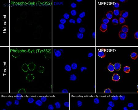 Immunocytochemistry analysis of Ramos cells untreated / serum starved for 16 hours add 12μg/mL human IgM (diluted in serum free medium) for 2 minutes labeling Phospho-Syk (Y352) with Rabbit anti-Phospho-Syk (Y352) antibody (HA751422) at 1/1,000 dilution. Cells were fixed in 4% paraformaldehyde for 15 minutes at room temperature, permeabilized with 0.1% Triton X-100 in PBS for 15 minutes at room temperature, then blocked with 1% BSA in 10% negative goat serum for 1 hour at room temperature. Cells were then incubated with Rabbit anti-Phospho-Syk (Y352) antibody (HA751422) at 1/1,000 dilution in 1% BSA in PBST overnight at 4 ℃. Goat Anti-Rabbit IgG H&L (iFluor™ 488, HA1121) was used as the secondary antibody at 1/1,000 dilution. PBS instead of the primary antibody was used as the secondary antibody only control. Nuclear DNA was labelled in blue with DAPI. Beta tubulin (HA601187, red) was stained at 1/100 dilution overnight at +4℃. Goat Anti-Mouse IgG H&L (iFluor™ 594, HA1126) was used as the secondary antibody at 1/1,000 dilution.