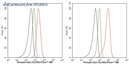 Flow cytometric analysis of Ramos cells untreated (left) / serum starved for 16 hours add 12μg/mL human IgM (diluted in serum free medium) for 2 minutes (right) labeling Phospho-Syk (Y352). Cells were fixed and permeabilized. Then stained with the primary antibody (HA723362, 1/1,000) (red) compared with Rabbit IgG Isotype Control (green). After incubation of the primary antibody at +4℃ for an hour, the cells were stained with a iFluor™ 488 conjugate-Goat anti-Rabbit IgG Secondary antibody (HA1121) at 1/1,000 dilution for 30 minutes at +4℃. Unlabelled sample was used as a control (cells without incubation with primary antibody; black).