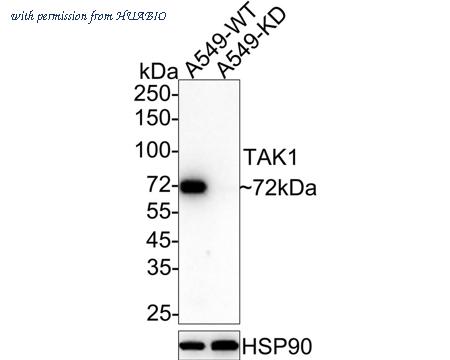 Western blot analysis of TAK1 on different lysates with Rabbit anti-TAK1 antibody (HA750424) at 1/1,000 dilution. Lane 1: A549-WT cell lysate Lane 2: A549-KD TAK1 cell lysate Lysates/proteins at 10 µg/Lane. Predicted band size: 67 kDa Observed band size: 72 kDa Exposure time: 3 minutes; ECL: K1801; 4-20% SDS-PAGE gel. Proteins were transferred to a PVDF membrane and blocked with 5% NFDM/TBST for 1 hour at room temperature. The primary antibody (HA750424) at 1/1,000 dilution was used in 2% NFDM/TBST at 4℃ overnight. Goat Anti-Rabbit IgG - HRP Secondary Antibody (HA1001) at 1/50,000 dilution was used for 1 hour at room temperature.