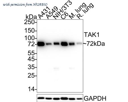 Western blot analysis of TAK1 on different lysates with Rabbit anti-TAK1 antibody (HA750424) at 1/1,000 dilution. Lane 1: A431 cell lysate (20 µg/Lane) Lane 2: A549 cell lysate (20 µg/Lane) Lane 3: NIH/3T3 cell lysate (20 µg/Lane) Lane 4: C6 cell lysate (20 µg/Lane) Lane 5: Mouse lung tissue lysate (40 µg/Lane) Lane 6: Rat lung tissue lysate (40 µg/Lane) Predicted band size: 67 kDa Observed band size: 72 kDa Exposure time: 10 seconds; ECL: K1801; 4-20% SDS-PAGE gel. Proteins were transferred to a PVDF membrane and blocked with 5% NFDM/TBST for 1 hour at room temperature. The primary antibody (HA750424) at 1/1,000 dilution was used in 5% NFDM/TBST at 4℃ overnight. Goat Anti-Rabbit IgG - HRP Secondary Antibody (HA1001) at 1/50,000 dilution was used for 1 hour at room temperature.