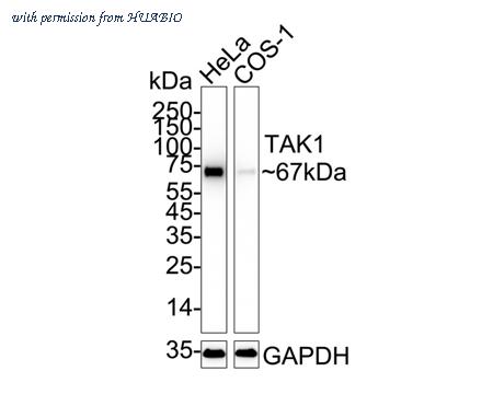 Western blot analysis of TAK1 on different lysates with Rabbit anti-TAK1 antibody (HA750424) at 1/1,000 dilution. Lane 1: HeLa cell lysate Lane 2: COS-1 cell lysate Lysates/proteins at 20 µg/Lane. Predicted band size: 67 kDa Observed band size: 67 kDa Exposure time: 15 seconds; ECL: K1801; 4-20% SDS-PAGE gel. Proteins were transferred to a PVDF membrane and blocked with 5% NFDM/TBST for 1 hour at room temperature. The primary antibody (HA750424) at 1/1,000 dilution was used in 5% NFDM/TBST at 4℃ overnight. Goat Anti-Rabbit IgG - HRP Secondary Antibody (HA1001) at 1/50,000 dilution was used for 1 hour at room temperature.