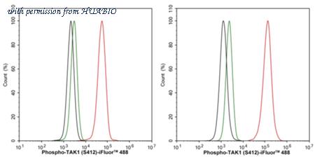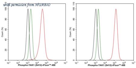 Flow cytometric analysis of NIH/3T3 cells untreated (left) / treated with 100nM Calyculin A for 30 minutes (right) labeling Phospho-TAK1 (S412). Cells were fixed and permeabilized. Then stained with the primary antibody (HA751525, 1/2,000) (red) compared with Rabbit IgG Isotype Control (green). After incubation of the primary antibody at +4℃ for an hour, the cells were stained with a iFluor™ 488 conjugate-Goat anti-Rabbit IgG Secondary antibody (HA1121) at 1/1,000 dilution for 30 minutes at +4℃. Unlabelled sample was used as a control (cells without incubation with primary antibody; black).