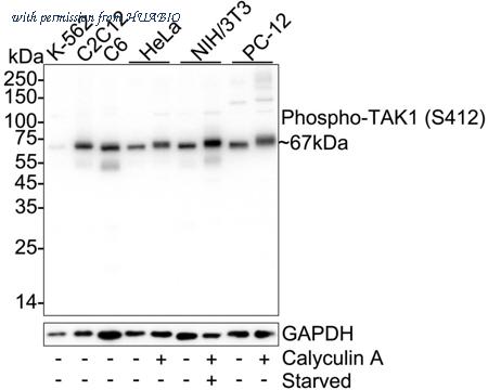 Western blot analysis of Phospho-TAK1 (S439) on different lysates with Rabbit anti-Phospho-TAK1 (S439) antibody (HA722242) at 1/25,000 dilution. Lane 1: K-562 cell lysate Lane 2: C2C12 cell lysate Lane 3: C6 cell lysate Lane 4: HeLa cell lysate Lane 5: HeLa treated with 100nM Calyculin A for 30 minutes cell lysate Lane 6: NIH/3T3 cell lysate Lane 7: NIH/3T3 starved overnight then treated with 100nM Calyculin A for 30 minutes cell lysate Lane 8: PC-12 cell lysate Lane 9: PC-12 treated with 100nM Calyculin A for 30 minutes cell lysate Lysates/proteins at 20 µg/Lane. Predicted band size: 67 kDa Observed band size: 67 kDa Exposure time: 10 seconds; ECL: K1801; 4-20% SDS-PAGE gel. Proteins were transferred to a PVDF membrane and blocked with 5% NFDM/TBST for 1 hour at room temperature. The primary antibody (HA722242) at 1/25,000 dilution was used in primary antibody dilution (K1803) at 4℃ overnight. Goat Anti-Rabbit IgG - HRP Secondary Antibody (HA1001) at 1/50,000 dilution was used for 1 hour at room temperature.