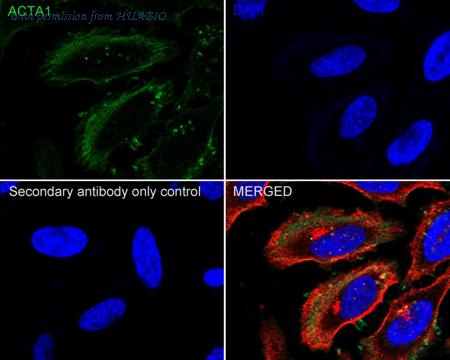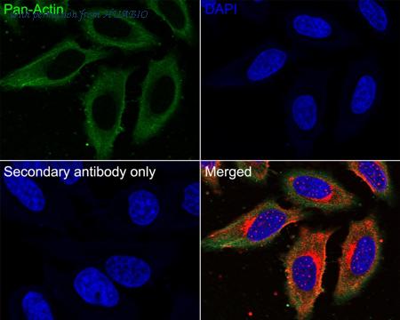 Immunocytochemistry analysis of HeLa cells labeling Pan-Actin with Mouse anti-Pan-Actin antibody (HA601287) at 1/100 dilution. Cells were fixed in 100% precooled methanol for 5 minutes at room temperature, then blocked with 1% BSA in 10% negative goat serum for 1 hour at room temperature. Cells were then incubated with Mouse anti-Pan-Actin antibody (HA601287) at 1/100 dilution in 1% BSA in PBST overnight at 4 ℃. Goat Anti-Mouse IgG H&L (iFluor™ 488, HA1125) was used as the secondary antibody at 1/1,000 dilution. PBS instead of the primary antibody was used as the secondary antibody only control. Nuclear DNA was labelled in blue with DAPI. beta Tubulin (ET1602-4, red) was stained at 1/100 dilution overnight at +4℃. Goat Anti-Rabbit IgG H&L (iFluor™ 594, HA1122) were used as the secondary antibody at 1/1,000 dilution.