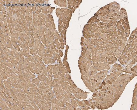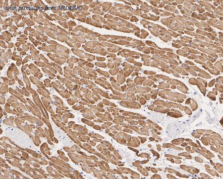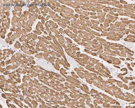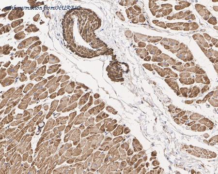 Immunohistochemical analysis of paraffin-embedded mouse heart tissue with Mouse anti-Alpha-cardiac actin antibody (HA601208) at 1/1,000 dilution. The section was pre-treated using heat mediated antigen retrieval with Tris-EDTA buffer (pH 9.0) for 20 minutes. The tissues were blocked in 1% BSA for 20 minutes at room temperature, washed with ddH2O and PBS, and then probed with the primary antibody (HA601208) at 1/1,000 dilution for 1 hour at room temperature. The detection was performed using an HRP conjugated compact polymer system. DAB was used as the chromogen. Tissues were counterstained with hematoxylin and mounted with DPX.