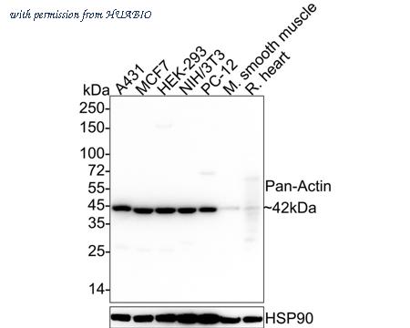 Western blot analysis of Pan-Actin on different lysates with Mouse anti-Pan-Actin antibody (HA600032) at 1/1,000 dilution. Lane 1: A431 cell lysate (20 µg/Lane) Lane 2: MCF7 cell lysate (20 µg/Lane) Lane 3: HEK-293 cell lysate (20 µg/Lane) Lane 4: NIH/3T3 cell lysate (20 µg/Lane) Lane 5: PC-12 cell lysate (20 µg/Lane) Lane 6: Mouse smooth muscle tissue lysate (40 µg/Lane) Lane 7: Rat heart tissue lysate (40 µg/Lane) Predicted band size: 42 kDa Observed band size: 42 kDa Exposure time: 9 seconds; 4-20% SDS-PAGE gel. Proteins were transferred to a PVDF membrane and blocked with 5% NFDM/TBST for 1 hour at room temperature. The primary antibody (HA600032) at 1/1,000 dilution was used in 5% NFDM/TBST at 4℃ overnight. Goat Anti-Mouse IgG - HRP Secondary Antibody (HA1006) at 1/50,000 dilution was used for 1 hour at room temperature.