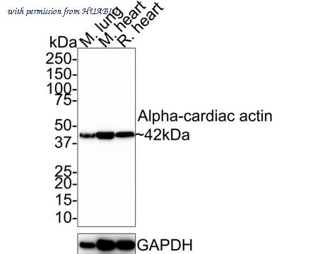 Western blot analysis of Alpha-cardiac actin on different lysates with Mouse anti-Alpha-cardiac actin antibody (HA601208) at 1/1,000 dilution. Lane 1: Mouse lung tissue lysate Lane 2: Mouse heart tissue lysate Lane 3: Rat heart tissue lysate Lysates/proteins at 40 µg/Lane. Predicted band size: 42 kDa Observed band size: 42 kDa Exposure time: 43 seconds; 4-20% SDS-PAGE gel. Proteins were transferred to a PVDF membrane and blocked with 5% NFDM/TBST for 1 hour at room temperature. The primary antibody (HA601208) at 1/1,000 dilution was used in 5% NFDM/TBST at 4℃ overnight. Goat Anti-Mouse IgG - HRP Secondary Antibody (HA1006) at 1/50,000 dilution was used for 1 hour at room temperature.