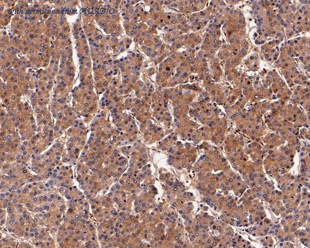Immunohistochemical analysis of paraffin-embedded human liver carcinoma tissue with Mouse anti-Peroxiredoxin 2 antibody (EM1701-70) at 1/1,000 dilution. The section was pre-treated using heat mediated antigen retrieval with Tris-EDTA buffer (pH 9.0) for 20 minutes. The tissues were blocked in 1% BSA for 20 minutes at room temperature, washed with ddH2O and PBS, and then probed with the primary antibody (EM1701-70) at 1/1,000 dilution for 1 hour at room temperature. The detection was performed using an HRP conjugated compact polymer system. DAB was used as the chromogen. Tissues were counterstained with hematoxylin and mounted with DPX.