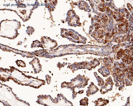 Immunohistochemical analysis of paraffin-embedded human breast carcinoma tissue with Mouse anti-Peroxiredoxin 2 antibody (HA601204) at 1/1,000 dilution. The section was pre-treated using heat mediated antigen retrieval with Tris-EDTA buffer (pH 9.0) for 20 minutes. The tissues were blocked in 1% BSA for 20 minutes at room temperature, washed with ddH2O and PBS, and then probed with the primary antibody (HA601204) at 1/1,000 dilution for 1 hour at room temperature. The detection was performed using an HRP conjugated compact polymer system. DAB was used as the chromogen. Tissues were counterstained with hematoxylin and mounted with DPX.