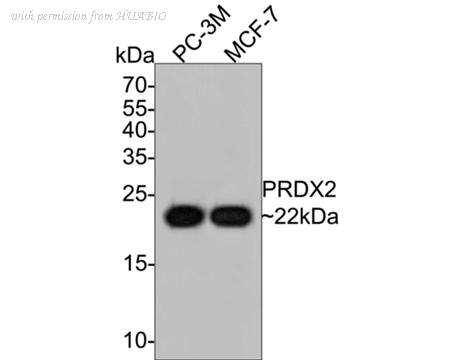 Western blot analysis of Peroxiredoxin 2 on different lysates with Mouse anti-Peroxiredoxin 2 antibody (EM1701-71) at 1/5,000 dilution. Lane 1: PC-3M cell lysate Lane 2: MCF-7 cell lysate Lysates/proteins at 10 µg/Lane. Predicted band size: 22 kDa Observed band size: 22 kDa Exposure time: 5 minutes; 15% SDS-PAGE gel. Proteins were transferred to a PVDF membrane and blocked with 5% NFDM/TBST for 1 hour at room temperature. The primary antibody (EM1701-71) at 1/5,000 dilution was used in 5% NFDM/TBST at room temperature for 2 hours. Goat Anti-Mouse IgG - HRP Secondary Antibody (HA1006) at 1:100,000 dilution was used for 1 hour at room temperature.