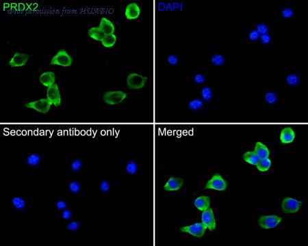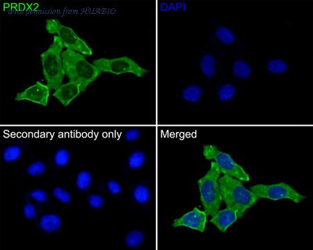 Immunocytochemistry analysis of HepG2 cells labeling Peroxiredoxin 2 with Mouse anti-Peroxiredoxin 2 antibody (EM1701-71) at 1/50 dilution. Cells were fixed in 4% paraformaldehyde for 30 minutes, permeabilized with 0.1% Triton X-100 in PBS for 15 minutes, and then blocked with 2% BSA for 30 minutes at room temperature. Cells were then incubated with Mouse anti-Peroxiredoxin 2 antibody (EM1701-71) at 1/100 dilution in 2% BSA overnight at 4 ℃. Goat Anti-Mouse IgG H&L (iFluor™ 488, HA1125) was used as the secondary antibody at 1/1,000 dilution. PBS instead of the primary antibody was used as the secondary antibody only control. Nuclear DNA was labelled in blue with DAPI.