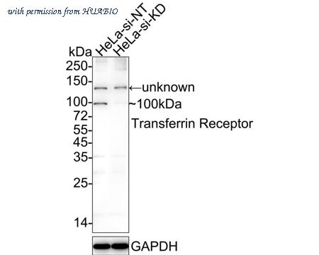 Western blot analysis of Transferrin Receptor (CD71) on different lysates with Rabbit anti-Transferrin Receptor (CD71) antibody (HA750333) at 1/1,000 dilution. Lane 1: HeLa-si NT cell lysate Lane 2: HeLa-si Transferrin Receptor cell lysate Lysates/proteins at 15 µg/Lane. Predicted band size: 85 kDa Observed band size: 100 kDa Exposure time: 1 minute 20 seconds; 4-20% SDS-PAGE gel. Proteins were transferred to a PVDF membrane and blocked with 5% NFDM/TBST for 1 hour at room temperature. The primary antibody (HA750333) at 1/1,000 dilution was used in 5% NFDM/TBST at room temperature for 2 hours. Goat Anti-Rabbit IgG - HRP Secondary Antibody (HA1001) at 1/50,000 dilution was used for 1 hour at room temperature.