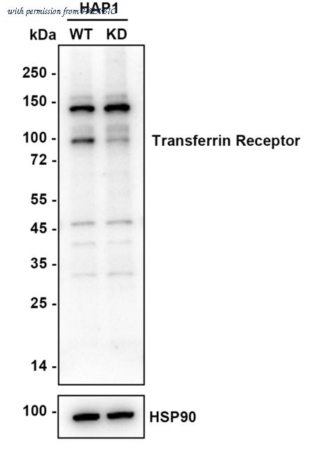 Western blot analysis of Transferrin Receptor (CD71) on different lysates with Rabbit anti-Transferrin Receptor (CD71) antibody (HA750333) at 1/5,000 dilution. Lane 1: HAP1 WT cell lysate Lane 2: HAP1 Transferrin Receptor KD cell lysate Lysates/proteins at 10 µg/Lane. Predicted band size: 85 kDa Observed band size: 90 kDa Exposure time: 1 minute 48 seconds; ECL: K1802; 4-20% SDS-PAGE gel. Proteins were transferred to a PVDF membrane and blocked with 5% NFDM/TBST for 1 hour at room temperature. The primary antibody (HA750333) at 1/5,000 dilution was used in TBST at 4℃ overnight. Goat Anti-Rabbit IgG - HRP Secondary Antibody (HA1001) at 1/50,000 dilution was used for 1 hour at room temperature.