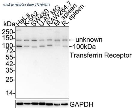Western blot analysis of Transferrin Receptor (CD71) on different lysates with Rabbit anti-Transferrin Receptor (CD71) antibody (HA750333) at 1/2,000 dilution. Lane 1: HeLa cell lysate Lane 2: K-562 cell lysate Lane 3: SW480 cell lysate Lane 4: U-87 MG cell lysate Lane 5: RAW264.7 cell lysate Lane 6: Mouse spleen tissue lysate Lane 7: Rat spleen tissue lysate Lysates/proteins at 20 µg/Lane. Predicted band size: 85 kDa Observed band size: 100 kDa Exposure time: 5 minutes; 4-20% SDS-PAGE gel. Proteins were transferred to a PVDF membrane and blocked with 5% NFDM/TBST for 1 hour at room temperature. The primary antibody (HA750333) at 1/2,000 dilution was used in 5% NFDM/TBST at 4℃ overnight. Goat Anti-Rabbit IgG - HRP Secondary Antibody (HA1001) at 1:50,000 dilution was used for 1 hour at room temperature.