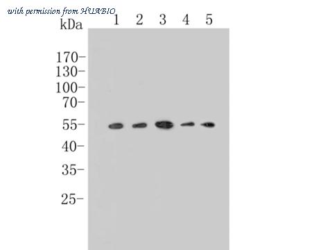 Western blot analysis of TGF beta 1 on different lysates. Proteins were transferred to a PVDF membrane and blocked with 5% BSA in PBS for 1 hour at room temperature. The primary antibody (HA500496, 1/500) was used in 5% BSA at room temperature for 2 hours. Goat Anti-Rabbit IgG - HRP Secondary Antibody (HA1001) at 1:200,000 dilution was used for 1 hour at room temperature. Positive control: Lane 1: PC-3 cell lysate Lane 2: A549 cell lysate Lane 3: U87 cell lysate Lane 4: Hela cell lysate Lane 5: K562 cell lysate