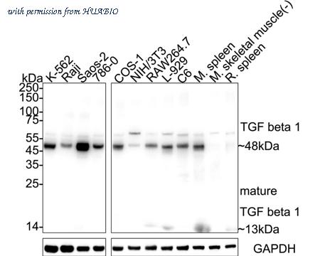 Western blot analysis of TGF beta 1 on different lysates with Rabbit anti-TGF beta 1 antibody (HA750485) at 1/5,000 dilution. Lane 1: K-562 cell lysate Lane 2: Raji cell lysate Lane 3: Saos-2 cell lysate Lane 4: 786-0 cell lysate Lane 5: COS-1 cell lysate Lane 6: NIH/3T3 cell lysate Lane 7: RAW264.7 cell lysate Lane 8: L-929 cell lysate Lane 9: C6 cell lysate Lane 10: Mouse spleen tissue lysate Lane 11: Mouse skeletal muscle tissue lysate (negative) Lane 12: Rat spleen tissue lysate Lysates/proteins at 20 µg/Lane. Predicted band size: 44 kDa Observed band size: 48/13 kDa Exposure time: 10 seconds; ECL: K1801; 4-20% SDS-PAGE gel. Proteins were transferred to a PVDF membrane and blocked with 5% NFDM/TBST for 1 hour at room temperature. The primary antibody (HA750485) at 1/5,000 dilution was used in primary antibody dilution (K1803) at 4℃ overnight. Goat Anti-Rabbit IgG - HRP Secondary Antibody (HA1001) at 1/50,000 dilution was used for 1 hour at room temperature.