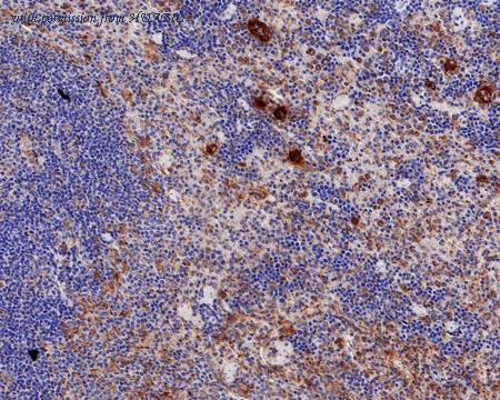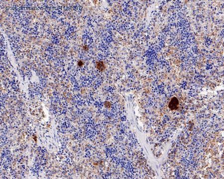 Immunohistochemical analysis of paraffin-embedded rat spleen tissue with Rabbit anti-TGF beta 1 antibody (HA750485) at 1/200 dilution. The section was pre-treated using heat mediated antigen retrieval with Tris-EDTA buffer (pH 9.0) for 20 minutes. The tissues were blocked in 1% BSA for 20 minutes at room temperature, washed with ddH2O and PBS, and then probed with the primary antibody (HA750485) at 1/200 dilution for 1 hour at room temperature. The detection was performed using an HRP conjugated compact polymer system. DAB was used as the chromogen. Tissues were counterstained with hematoxylin and mounted with DPX.