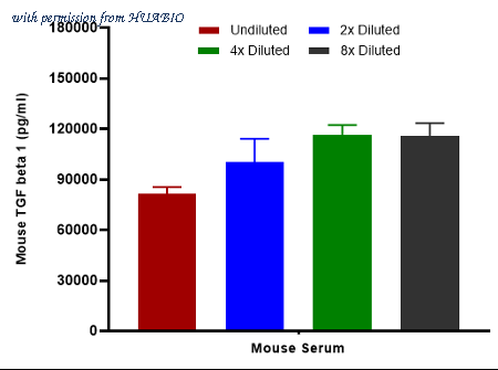 Interpolated concentrations of native TGF beta 1 in mouse samples. Capture: HA723725, TGF beta 1 Rabbit mAb [PSH15-21] Detector: HA723726, TGF beta 1 Rabbit mAb [PSH15-22] Interpolated concentration of native TGF beta 1 was measured in duplicate at different sample concentrations. The interpolated dilution factor corrected values were plotted (mean +/- SD, n=2). The mean TGF beta 1 concentration was determined to be 103 ng/mL in mouse serum.