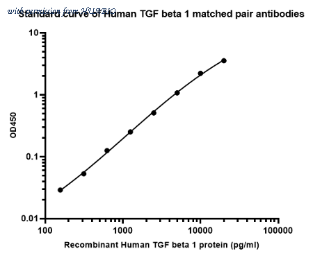 Sandwich ELISA analysis of Human TGF beta 1 matched pair antibodies Capture: HA723725, TGF beta 1 Rabbit mAb [PSH15-21] Detector: HA723726, TGF beta 1 Rabbit mAb [PSH15-22] Elisa assay was performed by coating wells of a 96-well plate with 100 µl per well of capture antibody (HA723725) diluted in carbonate/bicarbonate buffer, at a concentration of 5ug/ml overnight at 4℃. Wells of the plate were washed, blocked with 150 µl 0.05% tween-20 1% BSA blocking buffer, and incubated with serial diluted Recombinant Human TGF beta 1 protein starting from 20000 pg/ml to 0 pg/ml and detect antibody (HA723726, Biotin, 0.2 µg/ml) for 1 hour at 30℃ with shaking. Then the plate was washed and incubated with 100 µl per well of SA-HRP for 0.5 hour at 30℃ with shaking. Detection was performed using an Ultra TMB Substrate for 10 minutes at room temperature in the dark. The reaction was stopped with sulfuric acid and absorbances were read on a spectrophotometer at 450 nm.