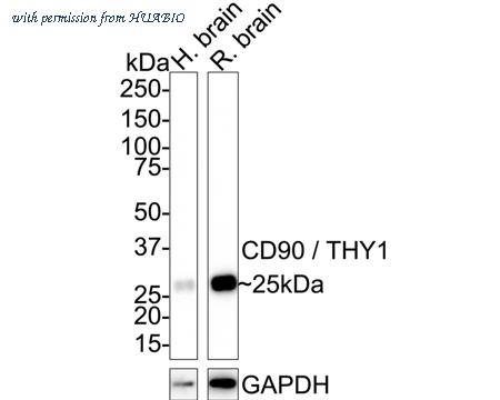 Western blot analysis of CD90 / THY1 on different lysates with Rabbit anti-CD90 / THY1 antibody (HA750149) at 1/2,000 dilution. Lane 1: Human brain tissue lysate (20 µg/Lane) Lane 2: Rat brain tissue lysate (20 µg/Lane) Predicted band size: 18 kDa Observed band size: 25 kDa Exposure time: 2 minutes 20 seconds; 4-20% SDS-PAGE gel. Proteins were transferred to a PVDF membrane and blocked with 5% NFDM/TBST for 1 hour at room temperature. The primary antibody (HA750149) at 1/2,000 dilution was used in 5% NFDM/TBST at 4℃ overnight. Goat Anti-Rabbit IgG - HRP Secondary Antibody (HA1001) at 1/50,000 dilution was used for 1 hour at room temperature.