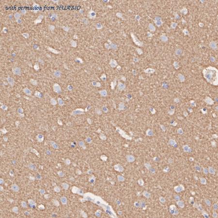 Immunohistochemical analysis of paraffin-embedded human brain tissue with Rabbit anti-CD90 / THY1 antibody (HA750149) at 1/1,000 dilution. The section was pre-treated using heat mediated antigen retrieval with Tris-EDTA buffer (pH 9.0) for 20 minutes. The tissues were blocked in 1% BSA for 20 minutes at room temperature, washed with ddH2O and PBS, and then probed with the primary antibody (HA750149) at 1/1,000 dilution for 1 hour at room temperature. The detection was performed using an HRP conjugated compact polymer system. DAB was used as the chromogen. Tissues were counterstained with hematoxylin and mounted with DPX.