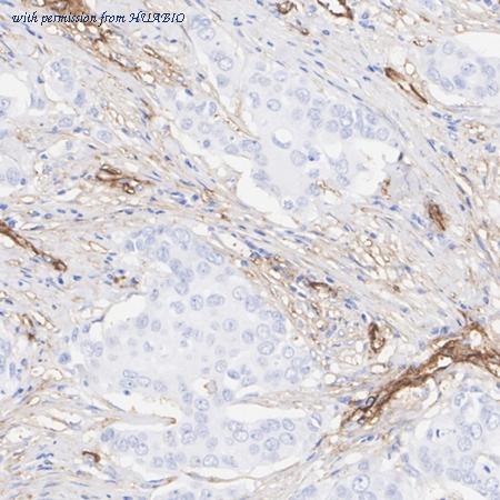 Immunohistochemical analysis of paraffin-embedded human breast cancer tissue with Rabbit anti-CD90 / THY1 antibody (HA750149) at 1/1,000 dilution. The section was pre-treated using heat mediated antigen retrieval with Tris-EDTA buffer (pH 9.0) for 20 minutes. The tissues were blocked in 1% BSA for 20 minutes at room temperature, washed with ddH2O and PBS, and then probed with the primary antibody (HA750149) at 1/1,000 dilution for 1 hour at room temperature. The detection was performed using an HRP conjugated compact polymer system. DAB was used as the chromogen. Tissues were counterstained with hematoxylin and mounted with DPX.