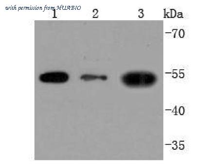 Western blot analysis of CD90 / THY1 on different lysates. Proteins were transferred to a PVDF membrane and blocked with 5% BSA in PBS for 1 hour at room temperature. The primary antibody (HA750364, 1/500) was used in 5% BSA at room temperature for 2 hours. Goat Anti-Rabbit IgG - HRP Secondary Antibody (HA1001) at 1:200,000 dilution was used for 1 hour at room temperature. Positive control: Lane 1: Hela cell lysate Lane 2: HepG2 cell lysate Lane 3: HUVEC cell lysate