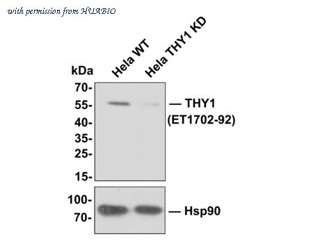 All lanes: Western blot analysis of THY1 with anti-CD90 / THY1 antibody[JF10-09] (ET1702-92) at 1:500 dilution. Lane 1: Wild-type Hela whole cell lysate (10 µg). Lane 2: THY1 knockdown Hela whole cell lysate (10 µg). ET1702-92 was shown to specifically react with THY1 in wild-type Hela cells. Weakened bands were observed when THY1 knockdown samples were tested. Wild-type and THY1 knockdown samples were subjected to SDS-PAGE. Proteins were transferred to a PVDF membrane and blocked with 5% NFDM in TBST for 1 hour at room temperature. The primary antibody (ET1702-92, 1/500) was used in 5% BSA at room temperature for 2 hours. Goat Anti-Rabbit IgG-HRP Secondary Antibody (HA1001) at 1:100,000 dilution was used for 1 hour at room temperature.