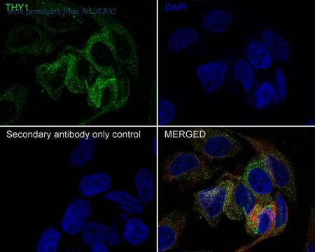 Immunocytochemistry analysis of HeLa cells labeling CD90 / THY1 with Rabbit anti-CD90 / THY1 antibody (ET1702-92) at 1/200 dilution. Cells were fixed in 4% paraformaldehyde for 10 minutes at 37 ℃, permeabilized with 0.05% Triton X-100 in PBS for 20 minutes, and then blocked with 2% negative goat serum for 30 minutes at room temperature. Cells were then incubated with Rabbit anti-CD90 / THY1 antibody (ET1702-92) at 1/200 dilution in 2% negative goat serum overnight at 4 ℃. Goat Anti-Rabbit IgG H&L (iFluor™ 488, HA1121) was used as the secondary antibody at 1/1,000 dilution. Nuclear DNA was labelled in blue with DAPI. Beta tubulin (M1305-2, red) was stained at 1/200 dilution overnight at +4℃. Goat Anti-Mouse IgG H&L (iFluor™ 594, HA1126) was used as the secondary antibody at 1/1,000 dilution.