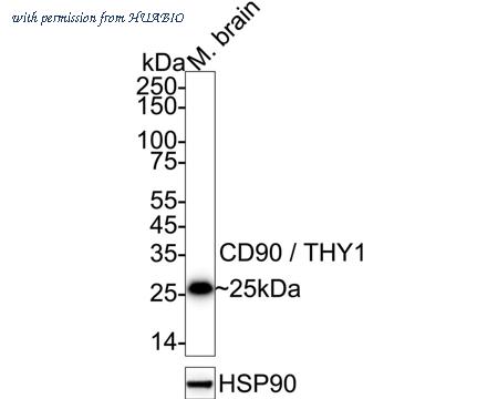 Western blot analysis of CD90 / THY1 on different lysates with Rabbit anti-CD90 / THY1 antibody (ET1608-46) at 1/2,000 dilution. Lane 1: Human brain tissue lysate (20 µg/Lane) Lane 2: Rat brain tissue lysate (20 µg/Lane) Predicted band size: 18 kDa Observed band size: 25 kDa Exposure time: 2 minutes 20 seconds; 4-20% SDS-PAGE gel. Proteins were transferred to a PVDF membrane and blocked with 5% NFDM/TBST for 1 hour at room temperature. The primary antibody (ET1608-46) at 1/2,000 dilution was used in 5% NFDM/TBST at 4℃ overnight. Goat Anti-Rabbit IgG - HRP Secondary Antibody (HA1001) at 1/50,000 dilution was used for 1 hour at room temperature.