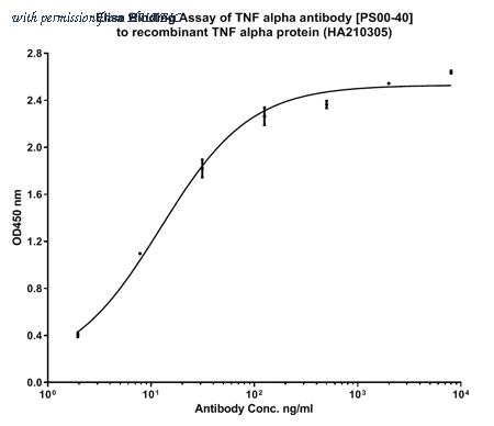 The binding activity of TNF-alpha (HA721266) with recombinant TNF-alpha protein. Immobilized recombinant TNF-alpha protein at 1 μg/ml overnight at 4℃. Then blocked with 1xTBS/1%BSA for 1 hour at 37℃, and incubated with the primary antibody (HA721266) for 45min at 37℃.