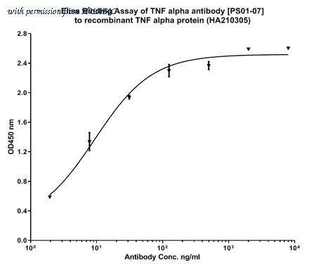 The binding activity of TNF-alpha (HA721265) with recombinant TNF-alpha protein. Immobilized recombinant TNF-alpha protein at 1 μg/ml overnight at 4℃. Then blocked with 1xTBS/1%BSA for 1 hour at 37℃, and incubated with the primary antibody (HA721265) for 45min at 37℃.