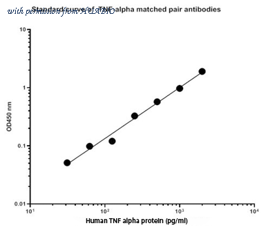 Standard curve of TNF-alpha matched pair antibodies: Sandwich ELISA analysis of TNF-alpha matched pair antibodies Elisa assay was performed by coating wells of a 96-well plate with 50 µl per well of capture antibody HA721265 [PS00-40] diluted in carbonate/bicarbonate buffer, at a concentration of 2 µg/mL overnight at 4℃. Wells of the plate were washed, blocked with 150 µl 1% BSA/PBST blocking buffer, and incubated with serial diluted recombinant TNF-alpha protein starting from 2000 pg/ml to 31.25 pg/ml for 1 hour at 37℃. The plate was washed and incubated with 50 µl per well of detect antibody [PS01-07] (Biotin, 1:4,000) for 1 hour at 37℃. Then the plate was washed and incubated with 50 µl per well of Streptavidin-HRP for 0.5 hour at 37℃. Detection was performed using an Ultra TMB Substrate for 10 minutes at room temperature in the dark. The reaction was stopped with sulfuric acid and absorbances were read on a spectrophotometer at 450 nm. Capture/detect antibodies, recombinant TNF-alpha protein, Streptavidin-HRP are diluted in 1% BSA/PBST.