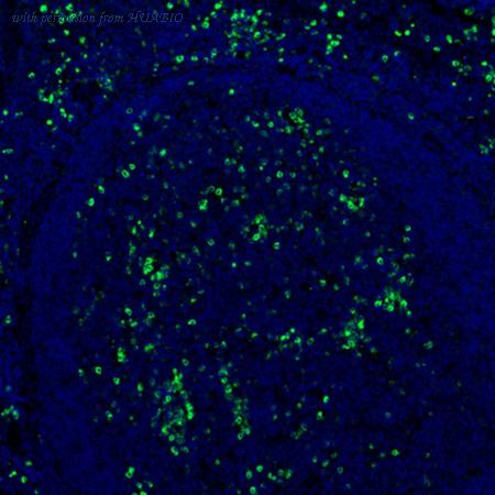 mIHC analysis of human tonsils tissue (Formalin/PFA-fixed paraffin-embedded sections) with Rabbit anti-Human TNF alpha antibody (HA721286) at 1/2,000 dilution. The immunostaining was performed with the IRISKitCmTSA Kit (900808). Heat mediated antigen retrieval with Tris-EDTA buffer (pH 9.0) for 30 mins at 95℃. DAPI (blue) was used as a nuclear counter stain. Image acquisition was performed with Olympus VS200 Slide Scanner.