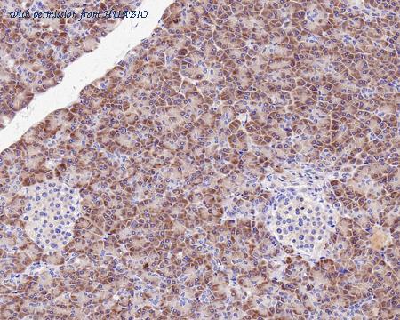Immunohistochemical analysis of paraffin-embedded human pancreas tissue with Rabbit anti-Human TNF alpha antibody (HA750593) at 1/200 dilution. The section was pre-treated using heat mediated antigen retrieval with Tris-EDTA buffer (pH 9.0) for 20 minutes. The tissues were blocked in 1% BSA for 20 minutes at room temperature, washed with ddH2O and PBS, and then probed with the primary antibody (HA750593) at 1/200 dilution for 1 hour at room temperature. The detection was performed using an HRP conjugated compact polymer system. DAB was used as the chromogen. Tissues were counterstained with hematoxylin and mounted with DPX.