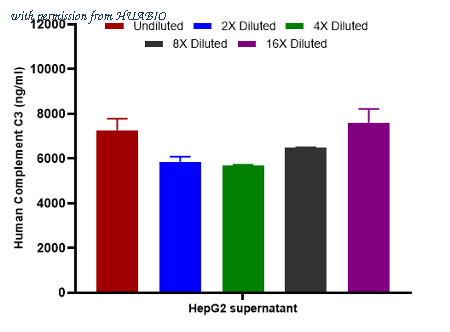 Interpolated concentrations of native Complement C3 in HepG2 cell culture supernatant. Capture: HA725140, Human Complement C3 Rabbit mAb [PSH15-07] Detector: HA725141, Human Complement C3 Rabbit mAb [PSH15-08] The concentrations of Complement C3 were measured in duplicates, interpolated from the Complement C3 standard curve and corrected for sample dilution. Undiluted samples are HepG2 cell culture supernatant 5%. The interpolated dilution factor corrected values are plotted (mean +/- SD, n=2). The mean Complement C3 concentration was determined to be 6,576 ng/ml in HepG2 cell culture supernatant.